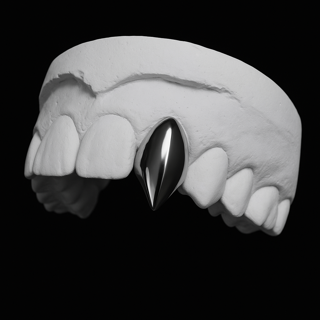 Bold & edgy: Dental Schmuck aus Chrom als Fangzähne. Die spitze Form bringt einen markanten Look, der sofort auffällt. Die Position ist frei wählbar – nicht nur auf dem Eckzahn.